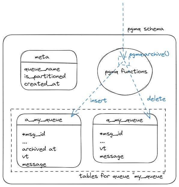 The next stage in the lifecycle of a message is archiving it. For that, pgmq uses the following insert statement: